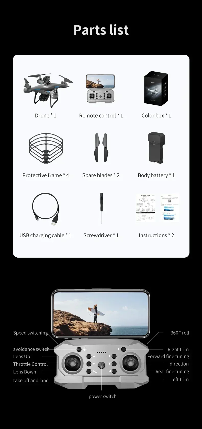 Three shots (front/vertical/above the head), four directions obstacle avoidance, optical flow positioning, electric lens, 8K high-definition pixel remote control, pneumatic loading, fixed height, high-definition image transmission